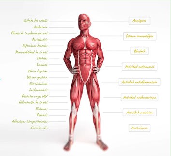 Reforzar el sistema inmunitario; reduce el dolor y la inflamación por reuma, artritis, tendinitis, contusiones…; reduce síntomas de asma alérgico, resfriados, gripes comunes, alergias, rinitis, sinusitis; es cicatrizante y coagulante; contiene calcio, potasio y celulosa; depurativo de la sangre; regulador del sistema digestivo; evita la pesadez, digestión lenta, acidez crónica…; para úlceras estomacales y duodenales; cicatriza las úlceras; regenera las células; regula la tiroides; activa la circulación; desintoxica el organismo; evita jaquecas, migrañas…; regula el colesterol; evita el cansancio; combate el estrés, depresión, ansiedad…; inhibe el dolor; calma dolor y cicatriza quemaduras; muy útil para hongos en la piel; psoriasis, eczemas…; retrasa el envejecimiento: atenúa las arrugas existentes y reduce la aparición de nuevas; acelera la formación de colágeno; mantiene la piel tersa y flexible, hidrata hasta las capas más profundas de la piel, etc, etc…